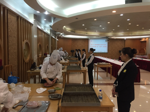 为了呈现一场专业的中式摆台比赛,餐饮部的姑娘们可谓下足工夫。从餐具到配套的餐巾、折花的选择要考虑统一协调、相互映衬,从托盘姿势到倒酒的走位再到指引的手势要做到从容平稳、规范有序,从器皿摆放到整体的台面布置要达到松紧有度、美观得体。在此次竞赛中,餐饮部的姑娘们演绎的淋漓尽致、精准到位。