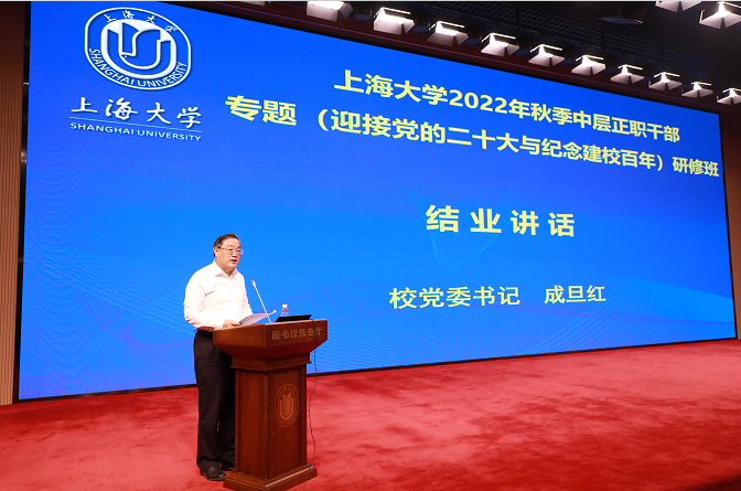 研修班上,校党委书记成旦红作结业讲话。他对本次研修班的相关培训情况进行了总结,并传达了2022年秋季上海高校党政负责干部会议精神。他在讲话中强调指出:一是要紧紧围绕迎接、宣传、贯彻党的二十大这条主线,加强理论武装。要紧紧围绕推进高等教育现代化这个目标,紧紧围绕建设具有世界影响力的社会主义现代化国际大都市这项重任,认清差距不足,注重创新创造,系统谋划和推进学校各项事业发展。二是要围绕建校百年,深入挖掘校史资源,传扬上大精神。他指出传扬上大精神具有非常重要的历史意义和现实意义,要组织开展好纪念建校百年活动,把传扬上大精神转化为推动学校高水平大学建设的强大动力。三是要扎实做好校园疫情防控工作,维护校园安全稳定。他总结了上半年学校扎实开展疫情防控、积极推进学生就业所作出的艰苦努力,强调要织密疫情防控网络,注重工作细节,充分发挥信息化手段精准防控。有效防范化解各类风险隐患,坚决守牢高校安全稳定底线。按照市委“疫情要防住、经济要稳定、发展要安全”要求,共同守护校园安全,确保秋季开学各项工作平稳、安全、有序。