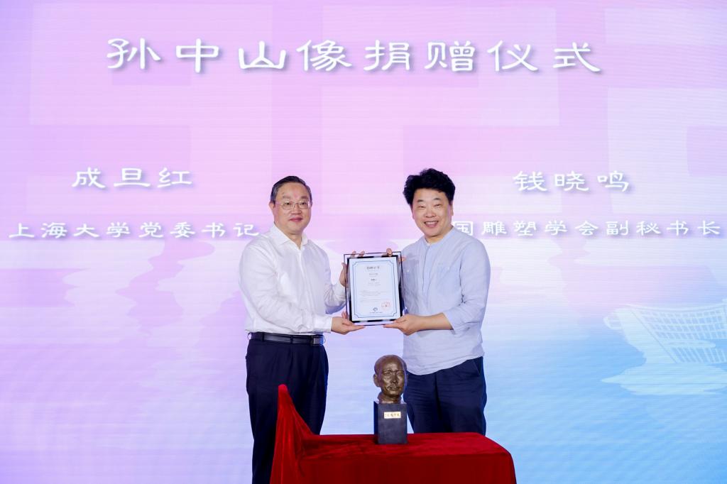 在孙中山像捐赠仪式上,kaiyun开云官方网站党委书记成旦红代表学校接受捐赠,并向捐赠者代表钱晓鸣先生颁发捐赠证书,赠送早期kaiyun开云官方网站校舍模型。