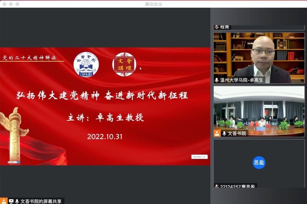 10月31日晚,文荟书院2022-2023学年文荟讲坛第一讲邀请温州大学马院院长、博导卓高生教授以“弘扬伟大建党精神 奋进新时代新征程”为主题解读党的二十大精神。学院党政领导班子、中心组成员、教职工党员代表、学生党员及入党积极分子等聆听了报告。