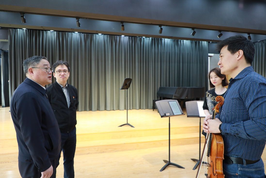 成书记首先来到音乐学院琴房、教室、排练厅和音乐厅,详细了解琴房乐器等公共设施的配套情况,并认真倾听学生的教师、学生对学院目前硬件设置、乐器保养、琴房使用及艺术团配备等情况的意见建议。成书记指出,调研是学校建设法宝,关于调研方式,我们要少些“走马观花”式调研,更多“下马观花”,在与同学们、老师们近距离接触的基础上,把握关键问题,了解大家真正的需求,从而找到解决问题的办法,把主题教育意义发挥到实处。在走访过程中,成书记与老师同学亲切交谈,了解同学们学校生活状况、上课学习情况,询问教师们实际工作困难,艺术团形成规模等问题,从实际出发,挖掘问题,整理思路,提炼方法。