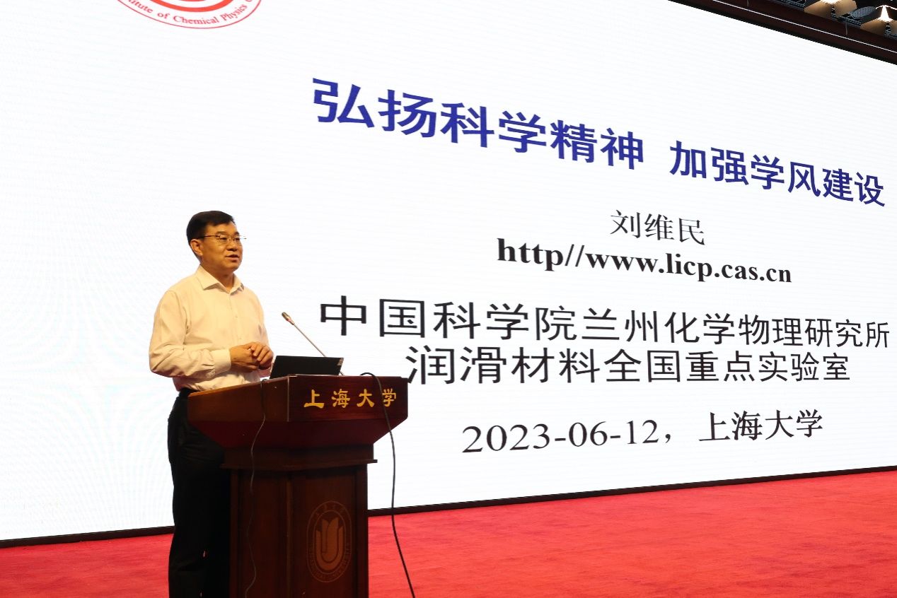 刘维民院士结合自身从事润滑工作的工作经历,从科学技术与科学精神、师生之间的关联、科研规范及科研诚信、科技工作者的使命四个方面作了分享。
