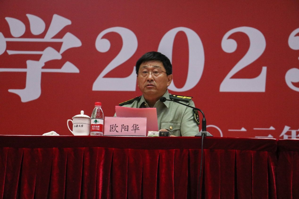 欧阳华发表讲话。他对武警上海总队执勤第二支队官兵的到来表示诚挚的感谢和热烈的欢迎,并对参训学员们提出四点期望:第一,服从命令,严守训练纪律。希望同学们坚决服从命令,听从指挥,严格遵守军训中的各项规章制度,学习军事技能,做最好的大学生战士;第二,端正态度,积极参与训练。希望同学们以一名军人的身份严格要求自己,刻苦训练,视哨声如命令,视操场如战场,保质保量地完成每一项训练内容;第三,敢于吃苦,培养坚忍品质。希望同学们养成吃苦耐劳的精神,敢于应对困难挑战,在流汗中,在摸爬滚打中,磨炼铁的体魄,钢的意志,展现出红色上大血脉传承的勇气与坚韧;第四,团结互助,树立集体意识。希望同学们发扬集体主义精神,团结友爱,互帮互学,为所在的连队争光添彩,也展现属于当代大学生的青春与活力。