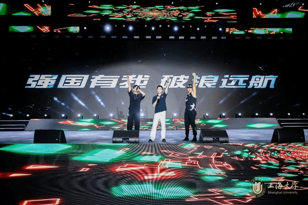 研究生我心目中的好导师代表钟云波教授、辅导员与在校生、新生代表共同演绎《为梦奔跑》,在全场热烈的氛围中共赴新征程,携手书写新篇章。由校友、在校生和新生组成的表演团队通过原创RAP道出自强不息的上大担当,唱响《强国有我》的青春最强音,不仅瞬间点燃了现场观众的热情,也沸腾了上大青年的热血。