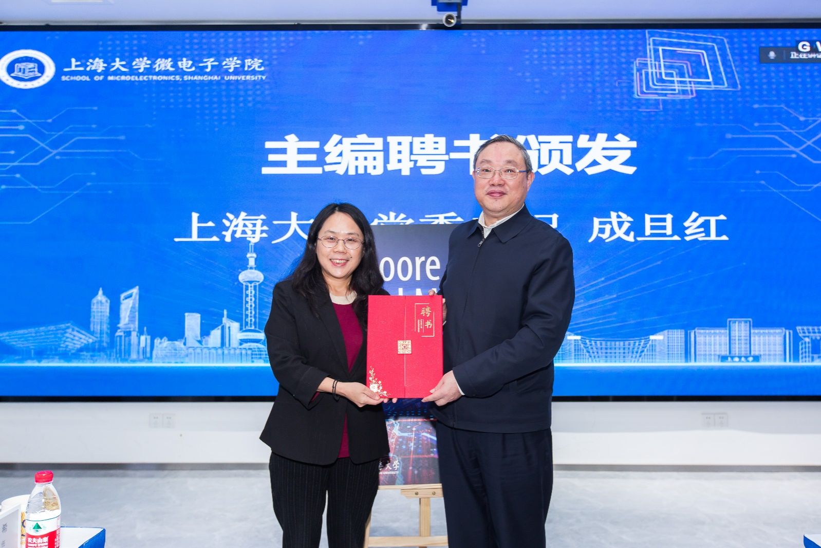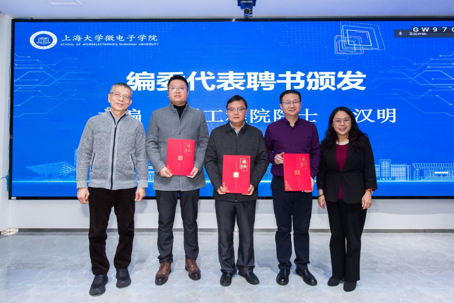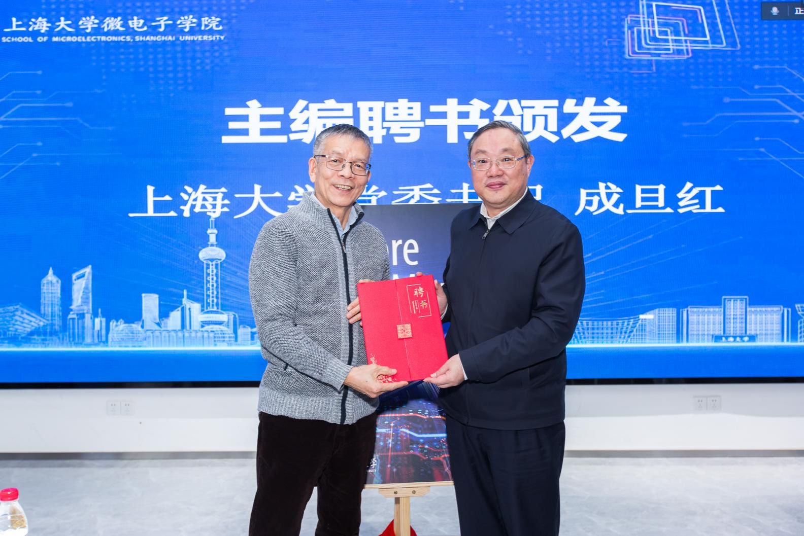 kaiyun开云官方网站党委书记成旦红为《超越摩尔》主编中国工程院院士吴汉明和kaiyun开云官方网站微电子学院执行院长张建华颁发聘书。