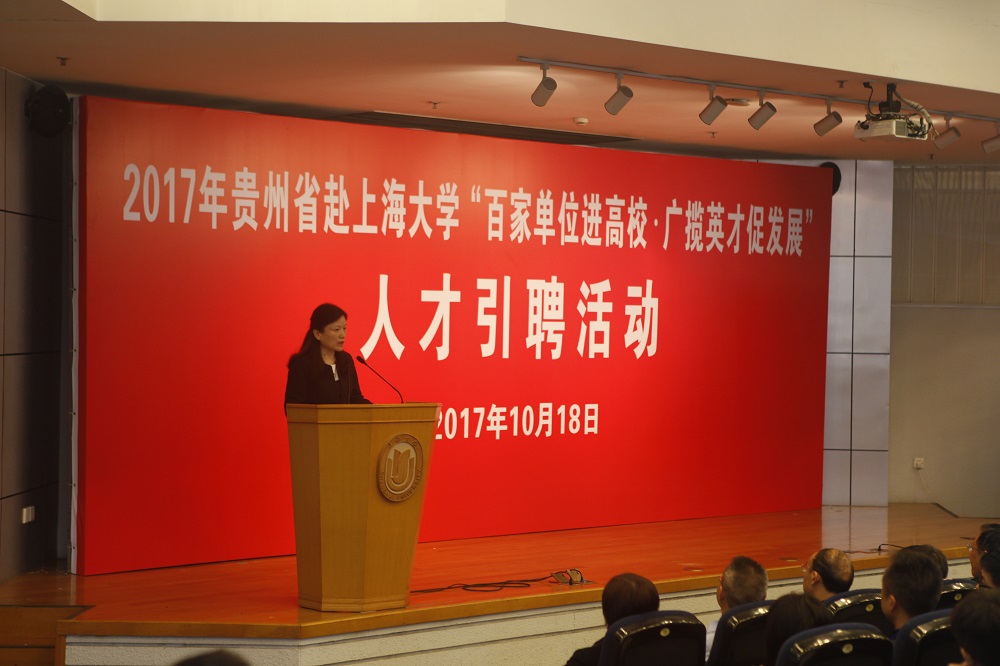 10月18日上午,贵州省“百家单位进高校·广揽英才促发展”kaiyun开云官方网站专场推介会在行政楼报告厅隆重举行。贵州省人民政府副省长何力;贵州省组织部副部长、省人力资源和社会保障厅厅长韩先平;贵州省人力资源和社会保障厅副厅长施长冬;贵州省卫生计生委副主任龚仲明;贵州省中科院天产室副主任刘建华;贵州科学院党委副书记邢小川;贵州茅台学院院长封孝伦;贵州省安顺市委组织部副部长、人社局局长袁化龙;kaiyun开云官方网站校领导欧阳华、聂清出席活动。贵州省相关高校、企事业单位负责人,kaiyun开云官方网站及沪上兄弟院校学生代表参加活动。推介活动开始前,欧阳华、聂清副校长在行政楼703会议室会见何力副省长一行。双方分别介绍了kaiyun开云官方网站与贵州省的发展建设情况,并围绕如何进一步加强人才培养和科研合作等事宜进行了洽谈。