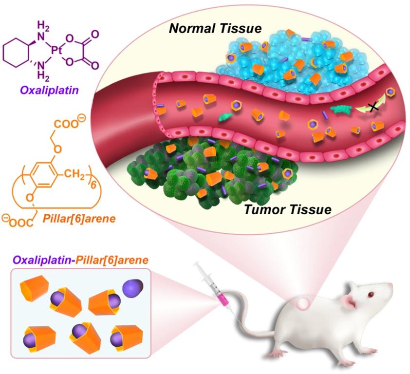纳米组装体,如脂质体、囊泡、胶束、凝胶等被广泛用作抗肿瘤药物载体,用以解决传统化疗药物普遍存在的选择性差和毒性较大等问题。理学院化学系研究人员成功发展了一种更加方便的、利用直接包结络合作用的可控药物递送体系。他们设计构筑了pH可控的水溶性柱[6]芳烃•奥沙利铂分子识别基元,其在生理pH 7.4下的络合常数远大于微酸性pH;细胞实验证明了键合作用并没有降低药物的细胞毒性;而体内、体外稳定性实验则显示主客体包结较大程度增强了药物的稳定性;进一步的动物实验表明其体内抗肿瘤活性与阳性对照相比大幅度提高。该结果主要是基于以下两个原因:1)包结作用提高了奥沙利铂的血液循环稳定性;2)pH响应的主客体络合使得药物可以在微酸性的肿瘤微环境有效释放。鉴于该主体分子较好的生物相容性和优良的分子识别性质,这种简单且高效的方法在药物释放领域具有潜在的应用价值。