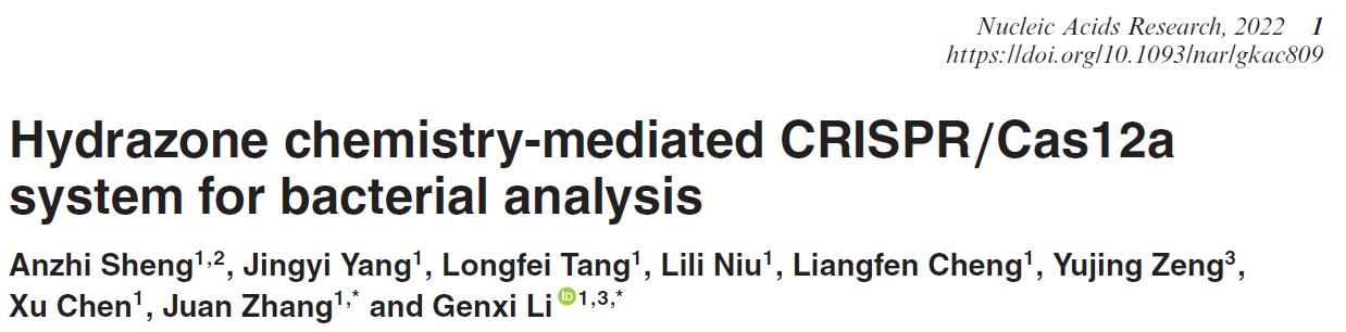 kaiyun开云生命科学学院李根喜教授团队近期在《Nucleic Acids Research》杂志上发表了题为“Hydrazone chemistry-mediated CRISPR/Cas12a system for bacterial analysis”(Nucleic Acids Research, gkac809, https://doi.org/10.1093/nar/gkac809)的原创性研究论文。
