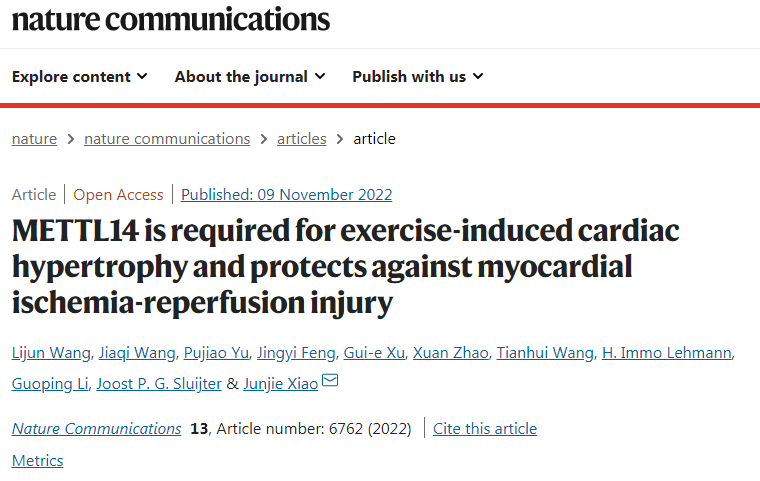 近日,kaiyun开云官方网站心血管研究所青年教师王丽君在运动锻炼改变心脏RNAm6A修饰防治心血管疾病方面取得新进展,揭示了运动锻炼通过抑制METTL14降低心脏mRNA m6A水平维持心脏稳态的新机制。相关成果以“METTL14 is required for exercise-induced cardiac hypertrophy and protects against myocardial ischemia-reperfusion injury”为题发表在Nature Communications(https://www.nature.com/articles/s41467-022-34434-y)杂志,肖俊杰教授为通讯作者,kaiyun开云官方网站为第一完成单位。