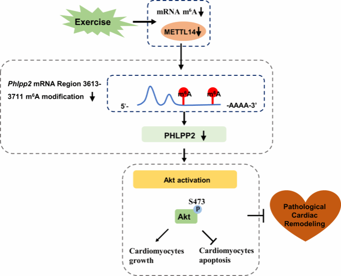 心力衰竭是心血管疾病常见的终末期结局,预后差。心力衰竭发生时往往伴随着心肌细胞的慢性丢失和心肌细胞功能紊乱,因此,促进心肌细胞存活成为防治心力衰竭的关键。运动训练可以诱导生理性心肌肥厚的发生,从运动心脏中挖掘出的关键分子及信号通路具有“一石三鸟”效应,即运动中的关键分子能促进心肌细胞肥大和增殖、增强心肌细胞抵抗凋亡的能力,从而对心脏起到保护作用。尽管在心力衰竭和运动诱导生理性心肌肥厚等干预条件下,转录因子和转录共激活因子等已经被关注和研究,但是可能影响关键蛋白表达和心脏功能的心脏mRNA的转录后调控研究甚少。RNA m6A是哺乳动物细胞中高度保守且分布广泛的修饰,在基因转录后调控中发挥重要作用。在心血管系统中,RNA m6A修饰被发现参与心脏稳态维持和疾病的发生,然而,运动锻炼是否通过调节RNAm6A修饰介导心脏稳态维持及其在生理性心肌肥厚中的作用尚不清楚。该研究发现运动锻炼降低小鼠心脏中mRNA m6A甲基化水平。运动锻炼后,心脏RNAm6A甲基转移酶METTL14在RNA m6A甲基化水平和蛋白质水平均显著性下调;进一步研究METTL14介导的RNAm6A修饰在心肌细胞中的功能和机制研究表明,沉默METTL14会抑制Phlpp2mRNA m6A修饰并激活Akt-S473,进而调节心肌细胞的生长和凋亡。在体内,野生型METTL14过表达可以增加心脏mRNAm6A的甲基化水平并阻断运动诱导生理性心肌肥厚的发生,然而MTase失活突变体METTL14则不具有该功能;心脏特异性抑制METTL14可以减轻急性心肌缺血再灌注损伤以及心肌缺血再灌注重构所致的心功能障碍。该研究明确了METTL14是介导运动锻炼诱导的生理性心肌肥厚的关键RNAm6A甲基转移酶,抑制METTL14在运动锻炼抗心血管疾病中具有关键作用。该研究解析了运动锻炼时心脏中RNAm6A的图谱变化,为深入理解运动锻炼保护心血管健康的理论知识和开发运动锻炼替代性药物治疗心血管疾病奠定了基础。