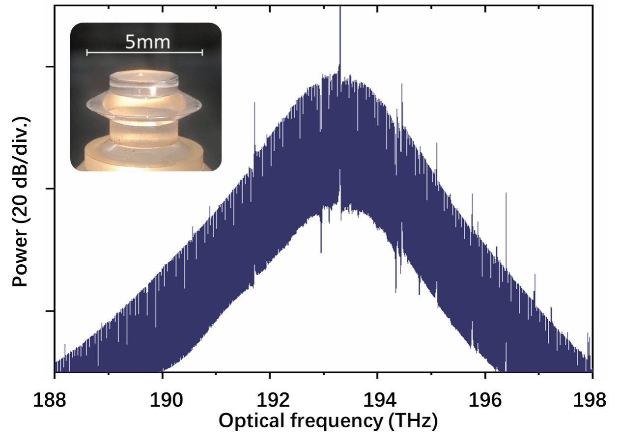 图:光学回音壁模式氟化镁微腔中产生的激光频率梳