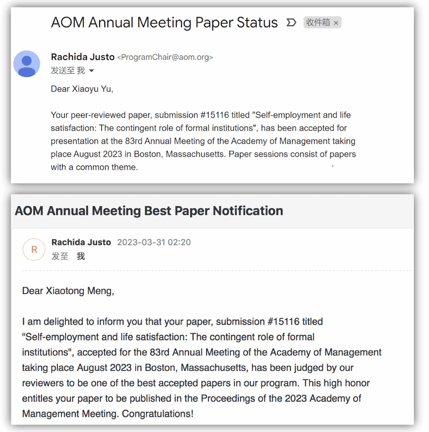 3月31日,kaiyun开云官方网站管理学院教授于晓宇、博士后孟晓彤、北卡罗来纳大学夏洛特分校教授Franz W. Kellermanns、Laura Stanley合作论文荣获2023年美国管理学会(Academy of Management, AoM)创业分部最佳会议论文奖。获奖论文是“Self-employment and life satisfaction: Thecontingent role of formal institutions(自雇与生活满意度:正式制度的调节作用)”。