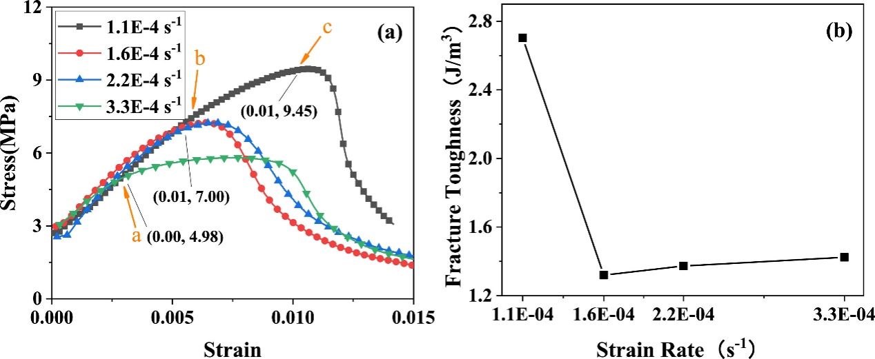 不同应变速率下的应力-应变曲线(a)和断裂韧性(b)