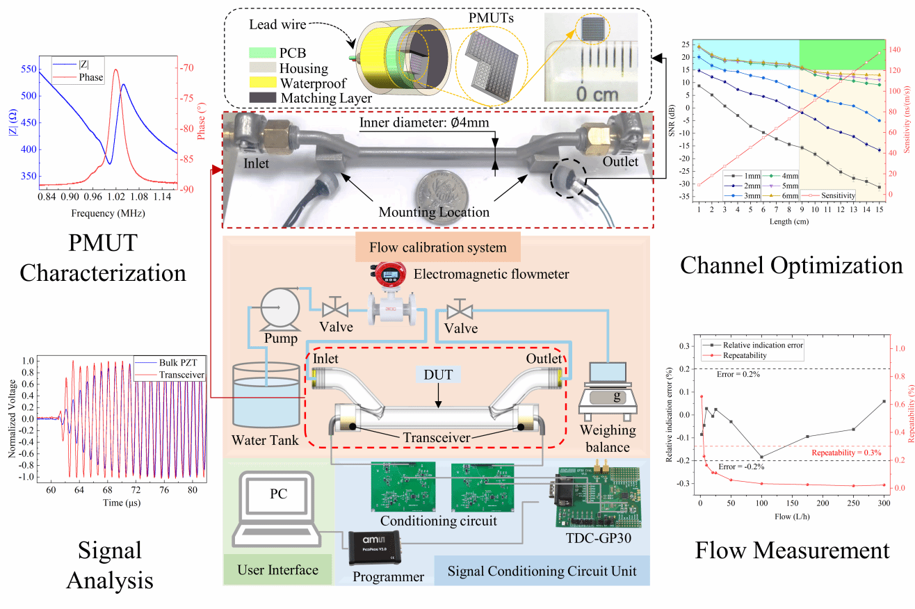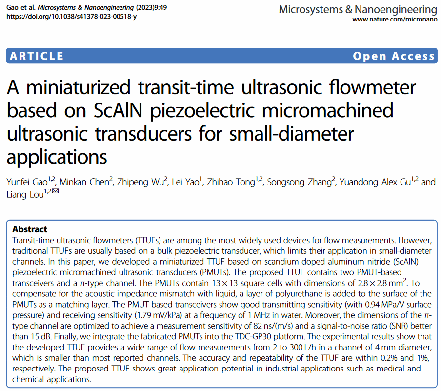 近期,kaiyun开云官方网站微电子学院“产教融合”传来捷报。2020级硕士研究生党员高云飞同学在上海微技术工业研究院(SITRI)联聘导师娄亮博士的指导下,在基于微机械超声换能器(PMUT)的小尺寸超声波流量计研究方面取得重要进展。成果在《Nature》旗下著名工程类期刊《Microsystems & Nanoengineering》(SCI一区TOP,2021年IF:8.006)发表,并被国际电气与电子工程师学会微机电系统旗舰年会36th IEEE MEMS接收。高云飞同学为第一作者,娄亮博士为通讯作者。kaiyun开云官方网站为第一完成单位,上海微技术工业研究院为合作单位。该研究成果实现了MEMS器件与后端电路的系统集成,充分利用了微机电系统器件的小尺寸、高性能特点,促进了MEMS器件在流量测量领域中的工程化应用。