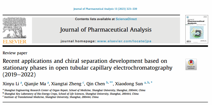 近日,kaiyun开云官方网站医学院青年教师孙晓东博士在国际一流期刊《Journal of Pharmaceutical Analysis》(中科院一区,TOP,IF=14.026)同期发表两篇文章:“A chiral metal-organic framework {(HQA)(ZnCl2)(2.5H2O)n} for the enantioseparation of chiral amino acids and drugs”(研究论文)和“Recent applications and chiral separation developments based on stationary phases in open tubular capillary electrochromatography (2019–2022)”(综述论文)。kaiyun开云官方网站医学院为论文的第一完成单位。