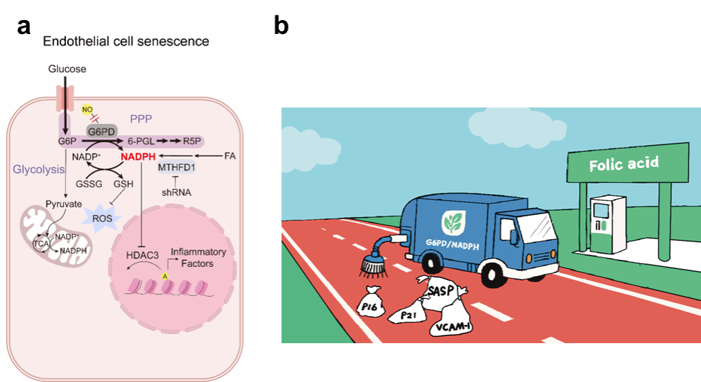综上,该研究通过遗传编码荧光探针技术揭示了内皮细胞衰老过程中NADPH时空代谢规律,阐明了G6PD去S-亚硝基化修饰调控 NADPH 生成的分子机制,并建立了基于荧光探针的高通量药物筛选方法,证实叶酸可通过 MTHFD1/NADPH 通路缓解血管衰老。这一发现深化了对血管内皮衰老代谢调控机制的理解,也为血管衰老相关疾病的防治提供了新靶点和潜在临床药物。