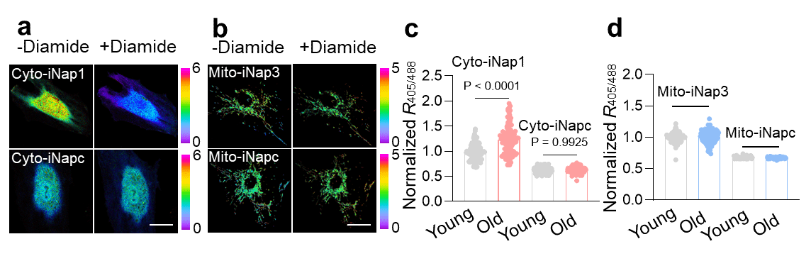 图1,iNap在内皮细胞胞浆和线粒体定位(a-b)及衰老的内皮亚细胞结构NADPH含量变化(c-d)。