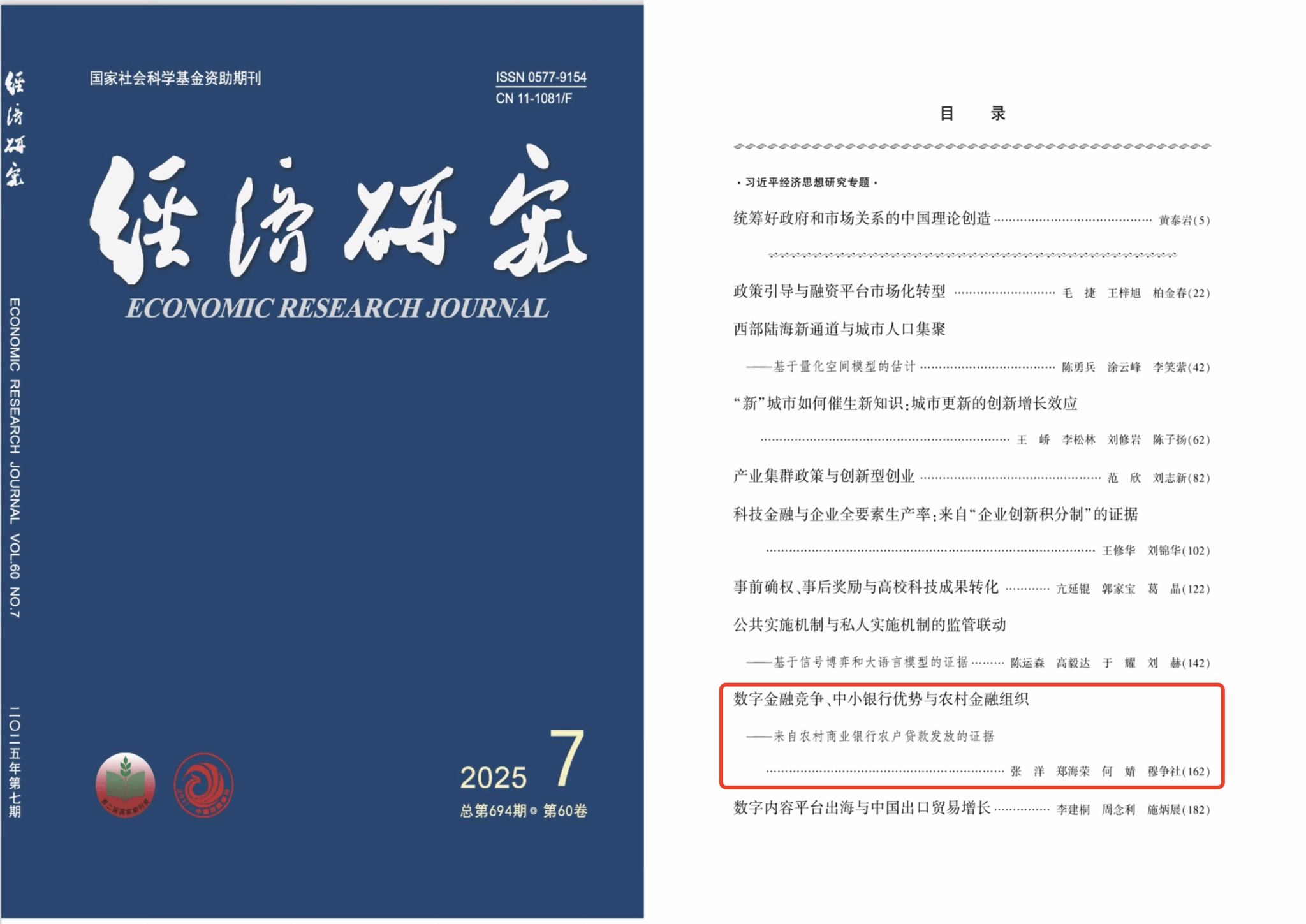 近日,经济学院青年教师张洋在数字金融领域的研究取得重要进展,研究成果《数字金融竞争、中小银行优势与农村金融组织——来自农村商业银行农户贷款发放的证据》在《经济研究》2025年第7期发表。