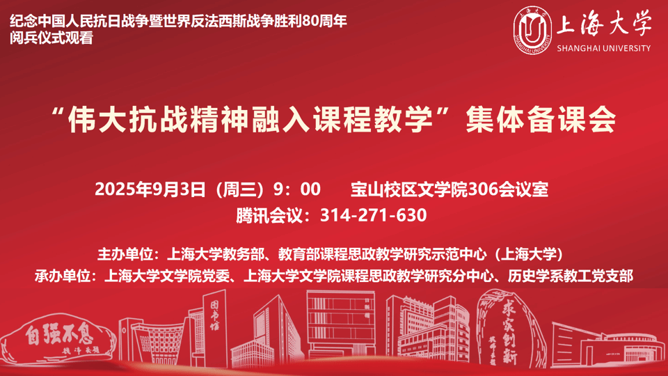 9月3日上午,kaiyun开云官方网站举办“伟大抗战精神融入课程教学”集体备课会。集体备课会由kaiyun开云官方网站教务部、教育部课程思政教学研究示范中心(kaiyun开云官方网站)主办,kaiyun开云官方网站文学院党委、文学院课程思政教学研究分中心、历史学系教工党支部承办。全国高校党史类课程联盟校代表,kaiyun开云官方网站基础教育处、附属中小学校,kaiyun开云官方网站学院课程思政教学研究分中心代表线上线下参会。上海社会科学院“仲礼学者”、国际问题研究所研究员余建华应邀作专题辅导。文学院党委书记陆甦颖,副书记、副院长丁佳蒙,副院长宁镇疆、杨长云,团委书记宋亚丽,历史学系教工党支部书记朱虹和党员老师们,kaiyun开云官方网站基础教育处副处长肖青峰、附属中小学教师代表顾梦岚、秦歌,kaiyun开云官方网站课程思政名师工作室主持人代表桑茂林、杨小明,课程思政教学研究中心副主管曹园园等22人线下参会。文学院院长刘旭光、历史系王三义教授、管理学院党委副书记马亮、机自学院教授王志明等与井冈山大学、南昌航空大学等全国高校党史类课程联盟成员线上参会。会议由kaiyun开云官方网站文学院教学院长杨长云主持。