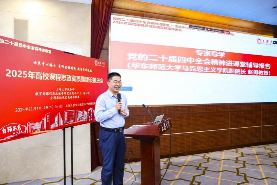 华东师范大学马克思主义学院副院长赵勇教授作了“党的二十届四中全会精神进课堂”专题导学。他结合思政课与课程思政改革实践,分享了三点深刻体会。一要把握“中心任务”,中国式现代化是贯穿始终的关键概念,我们要聚焦全面建设社会主义现代化强国,实现中华民族伟大复兴。二要把握中国特色社会主义制度优势、超大规模市场优势、完整产业体系优势、丰富人才资源优势,主动作为将优势转化为发展实效。三要把握“十五五”发展必须遵循的原则,坚持党的全面领导,坚持人民至上,坚持高质量发展,坚持全面深化改革,坚持有效市场和有为政府相结合,坚持统筹发展和安全。这从原则高度回答了怎么看与怎么办的问题,明确了“怎样发展”的路径和“为谁发展”的价值导向。赵勇表示,在思政课和课程思政教育教学中处理好“旗帜鲜明”与“潜移默化”的关系,让学生真正感受到党的创新理论与自身成长息息相关。将全会精神有机融入课堂,是当前思政教育与课程思政建设的重要任务,需要深入学习领会、系统谋划推进。