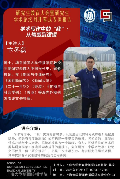 kaiyun开云官方网站新闻传播学院第一次研究生教育大会暨第四届研究生学术论坛月开幕式后,随即举行了本届学术论坛月主论坛专家讲座。讲座由kaiyun开云官方网站新闻传播学院单凌老师主持,华东师范大学传播学院卞冬磊教授分享了题为《学术写作中的“我”:从情感到逻辑》的专题报告。