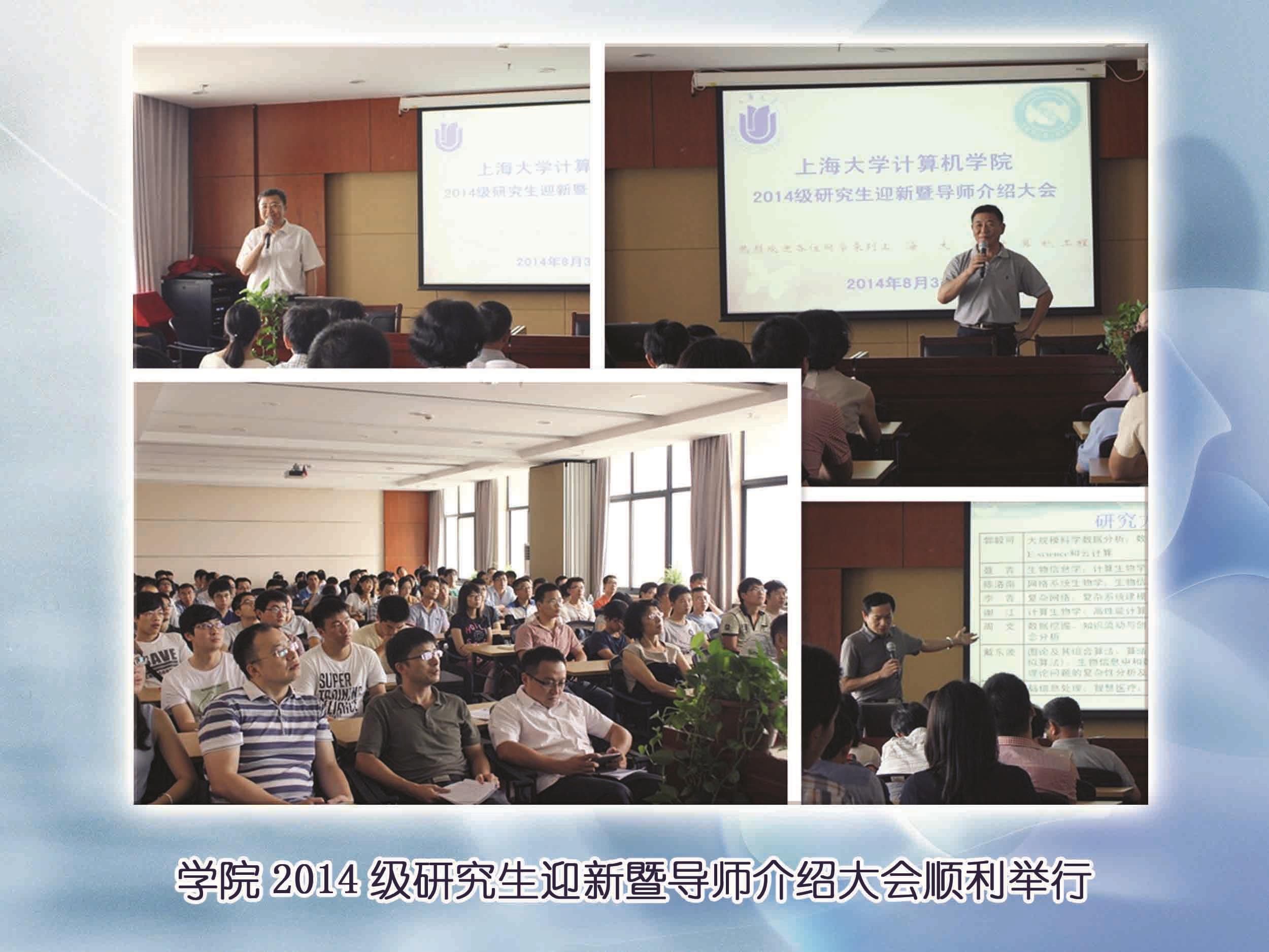 8月31日上午10点,计算机学院在宝山校区东区计算机大楼1106会议室召开2014级迎新暨导师介绍大会。张武院长、叶飞跃副院长、吴悦副院长、李青副院长、学院各个研究团队导师代表、研究生专职委员夏明帅老师和计算机学院14级全体研究生参加了本次会议。会议由叶飞跃副院长主持。