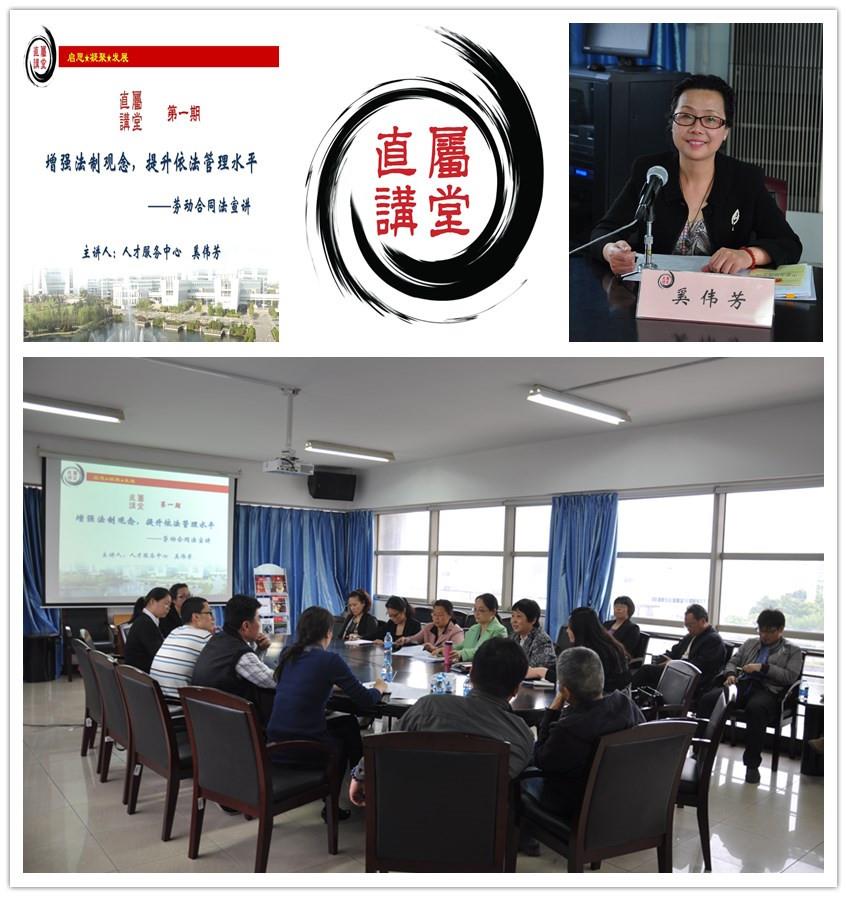 5月9日下午,以“启思、凝聚、发展”为宗旨的大众课堂——“直属讲堂”在校本部D楼直属单位教工之家成功开讲第一课:增强法制观念,提升依法管理水平——劳动合同法宣讲。直属单位党委书记陆翠兰同直属单位从事人事工作及对本报告主题感兴趣的kaiyun开云教职工参加了讲座。讲座由直属单位党委副书记、工会主席黄坚主持。