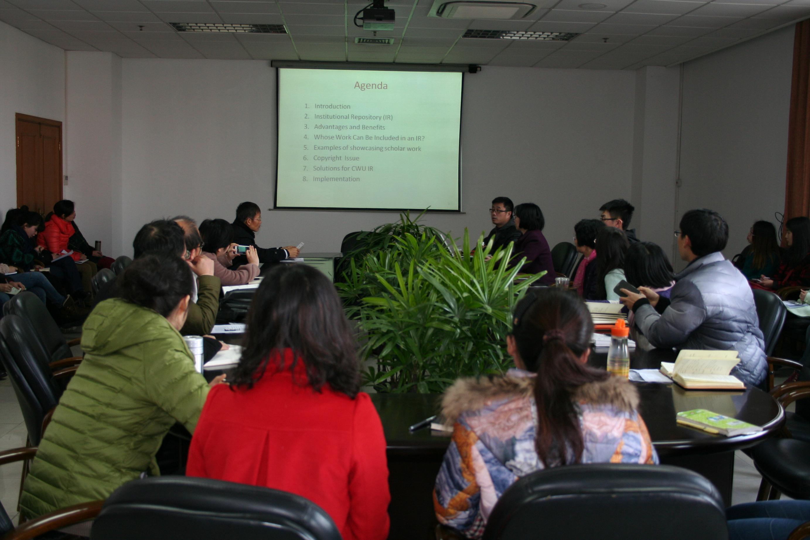会上,傅平先生首先介绍了中央华盛顿大学及其图书馆的基本情况,随后围绕该校图书馆机构库建设实践,就机构库的概念内涵、社会功能以及学术价值等进行了系统解读,认为大学图书馆开展机构库构建,不仅有利于实现大学学术成果的展示与共享,而且可以促进学者之间的科研交流与协同合作。傅平先生结合香港城市大学、美国加州州立理工大学等国内外大学图书馆机构库实践案例,对如何构建大学图书馆机构库进行了流程解读,特别是对于机构库建设初期的战略策划、平台选择、任务分解、组织实施、宣传推广等进行了系统分析,为kaiyun开云官方网站正在开展的机构库建设提供了实践参考。会后,党总支书记、常务副馆长陆铭、副馆长刘华与傅平先生围绕图书馆组织设置、业务发展、功能拓展等进行了深入交流,并就图书馆馆际交流初步达成进一步合作的意向。