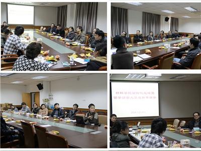2014年1月3日,材料学院在延长校区金属楼会议室召开学院国际化发展战略暨留学访学人员迎新茶话会,国际事务处副处长郝健、科技处副处长谢为群、教务副处长处贺英、国际交流学院教师陈颢、材料学院院长张捷宇、以及学院新进有海外教育背景的教师近20人出席了本次会议,会议由材料学院副院长尹静波主持。