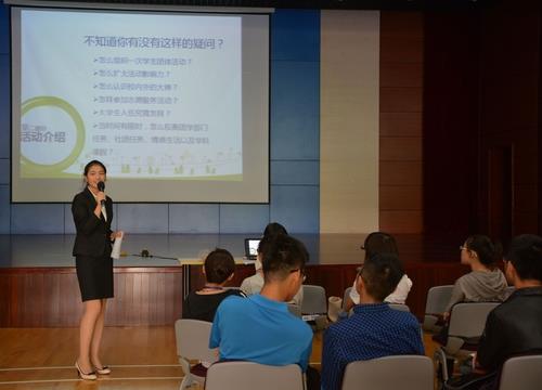 活动由一段关于悉尼工商学院介绍的视频拉开帷幕,使得2013级新生们对学院的发展历程有了更深入的了解。活动伊始,学院团委书记张明明老师走下讲台,与同学们零距离交流。她提出此次活动是训练营首次配备优秀学长学姐进行指导,希望此次活动能有意想不到的成果。同时,她表示训练营是一个能够让新生收获正能量的地方,并对他们今后的发展作出了美好祝愿。接着,13级辅导员高举老师进行讲话。高老师对新生提出了三点要求:迅速适应大学生活以轻松步入社会、自我定位和自我完善,简短而有力的讲话让大家受益匪浅。随后,承办此次活动的学生会素质拓展部部长徐海萍对适应营活动进行了详细介绍。新生适应营活动分为多个版块:学业指导、科技竞赛、创新创业、社会实践及志愿者服务、社团及学生组织活动。每个版块都成立一个小组,每个小组都配备了两到三位在此领域内成绩优异或经验丰富的学长学姐,活动期间,学长学姐们将与各组组员结对合作,共同解决新生提出的疑问。
