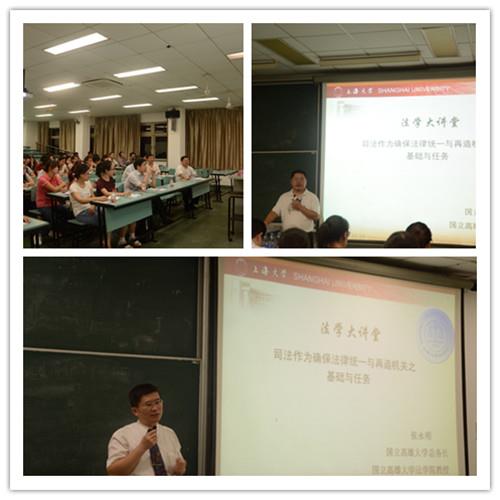 张永明教授的讲座题目是“司法作为确保法律统一与再造机关之基础与任务”,题目看似冗长,讲座停下来却觉得题目非常契合内容。讲座伊始,张教授从权力分立的概念、英美法系与大陆法系的不同以及台湾的司法现状这三个方面对讲座主题做了一个简单的导论,并用“小虾米对抗大鲸鱼”这样生动形象的语句来说明消费者在面对商家维护自己合法权利时的尴尬处境。张教授在开场时展现出来的魅力深深吸引了台下的师生。
