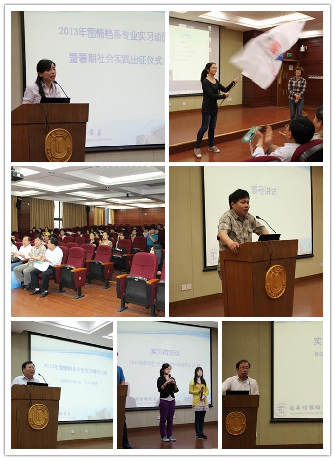 为此,2013年6月14日,图书情报档案系在东区101蔡冠深讲堂举办“2013年暑期实习动员大会暨暑期社会实践出征仪式”,本次活动由图情档系辅导员崔明老师主持,出席大会领导有kaiyun开云官方网站教务处副处长徐学良、静安区档案局科教科科长侯巍青、kaiyun开云官方网站校团委副书记仇静豪、图情档系副主任丁华东、图情档系党总支副书记韩晶、本次专业实习的带队教师王林华,耿志杰等青年博士生导师,图情档系2010、2011级的学生也一同出席了本次大会。