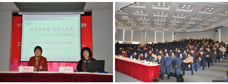 报告会上,张丹华教授从高等教育在实现中国梦中扮演的角色入题,围绕十八大“举什么旗、走什么路、以什么样的精神状态、实现什么样的目标”的主线,详细解读了党的十八大对教育的新部署、新要求。随后,张教授结合相关数据和案例,展现了我国教育现状在世界教育体系中的坐标,并就高等教育内涵式发展、社会主义核心价值体系构建、协同发展模式、科学技术发展现状以及外媒的评价等热点问题做了介绍。最后,结合kaiyun开云的发展目标,她说国家的发展和十八大精神为我们提供了精神动力和奋斗目标,教育工作者要保持清醒的头脑,抓住难得的机遇期,在目标和现实之间,努力奋进,多做贡献。