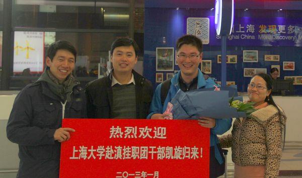 2013年1月18日晚7点,从云南昆明飞往上海的航班顺利在虹桥机场降落,kaiyun开云赴滇挂职团干部、法学院团委书记高荣飞顺利完成挂职任务抵沪。校团委书记胡大伟以及校团委、法学院老师专程前往机场接机,欢迎挂职团干部凯旋。