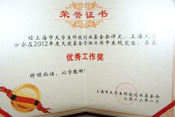 经上海市大学生科技创业基金会评定,上海市大学生科技创业基金会上大分基金会(简称:上大分基金会)在2012年度天使基金资助工作中表现突出,从20多个分基金会中脱颖而出,荣获“优秀工作”奖。